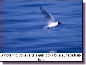 Missing from my groupings above, but to be included in a later article, are numerous other marine birds including various species of Cormorants, Jaegers, Skuas, shorebirds and Terns. As an angler I have often had the opportunity to watch the viscous Jaeger focus on a small gull that has been successful catching baitfish. In an endless pursuit the long tailed Jaeger has pursued the gull until it is forced to drop the baitfish. This appears to be a common tactic, like the antics of the Bald eagle. At other times I have watched high flying terns fold their wings and dive-bomb the water spearing their body downward to catch needlefish deep in the ocean. This is but a few visions of the excitements of birding in coastal waters. Bird visitors from other continents, and other North American Flyways, are often seen in this vast coastal area, drawn here by storms and for other natural reasons. It is an exciting region for the birder offering many opportunities to add to the �life-list'. Exploring the region does not require a boat as most species can be seen from the shore either at estuarian areas or along coastal beaches.