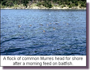 Auks form the next most common group of coastal birds. This group includes species such as; Common Murres, Rhinoceros Auklet, Ancient Murrelet, Marbled Murrelet, Pigeon Guillemont, Cassin's Auklet and the Tufted Puffin. Boating in any coastal bay or inlet, the traveler will spot these marine birds in groups and pairs. The constant peeping of paired murrelets is heard in areas where these birds have found schools of yearling baitfish. If watched for any length of time the observer will see these birds pop to the surface with one or two silver baitfish in their beaks.