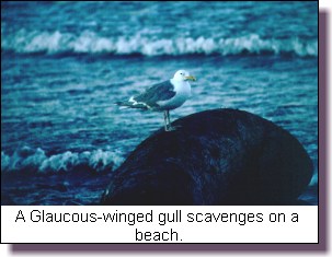 Gulls are the most obvious of all coastal birds. They always seem to be in the skyline, cruising with coastal winds or standing aloof on piers or the beach. There are eleven common species with the �Glaucous-winged gull' being the most common. Other common west coast gulls include the crow sized Thayer's gull and Herring gull, and the smaller falcon sized Mew gull and Bonaparte's gull. These latter two are often referred to as the �coho gulls' because of their habit of feeding on yearling herring in the same location as feeding coho salmon.