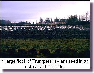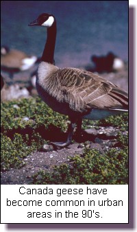 , the largest waterfowl in North America and, the Whistling swan. Four species of geese are common migrating visitors, Snows, Brant, White-fronted and Canada geese. Interestingly, the Canada goose is the only natural breeding goose in British Columbia. Numbers of Canada geese have increased dramatically in the 90's and they have become a serious wildlife nuisance in many areas particularly near urban centers.