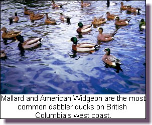 Dabbling ducks, what are often called, �bottom-up' ducks are common near freshwater estuarian areas, their preferred migrating resting and staging habitat. The Strait of Georgia marks the northern wintering zone of the Pacific Flyway. In moderate winters hundreds of thousands of Mallards, Northern Pintails, American Widgeon, Teals and other dabblers will be found in this area.